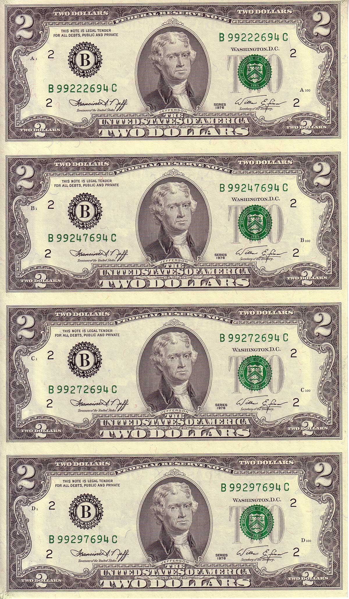 Uncut Sheet Of 4 1976 2 Two Dollar Bills