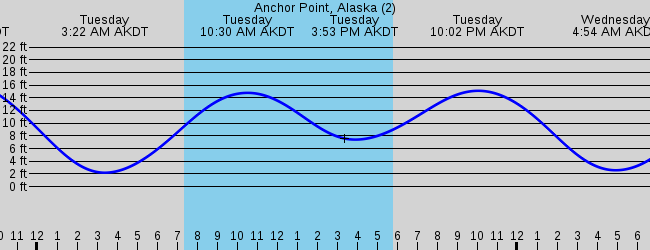 As you can see on the tide chart the highest tide of 18 96ft was at 2 34 am and the lowest tide of 2 56ft was at 9 12 am. The red flashing dot shows the tide time right now. High tides and low tides surf reports sun and moon rising and setting times lunar phase fish activity and weather conditions in anchor point cook inlet.