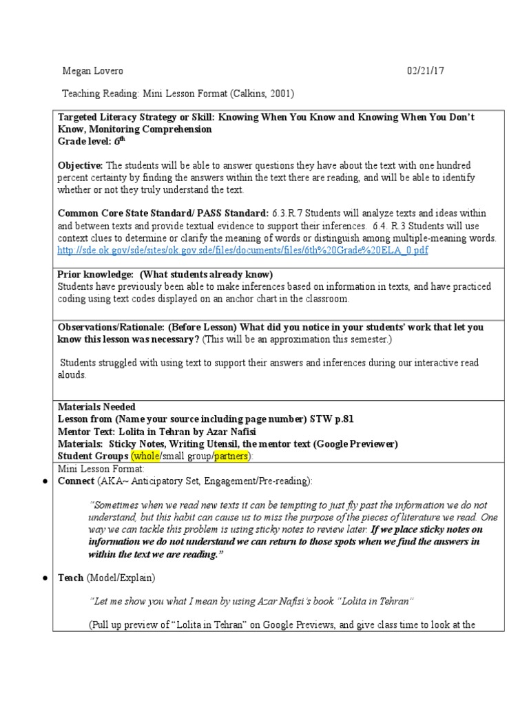 Lovero Lesson Plan 2 Reading Process Educational Psychology