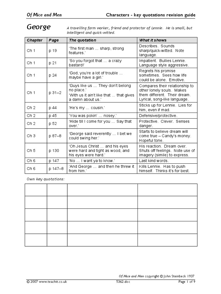 Key Character Quotes For Of Mice And Men Teaching Resources