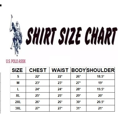 The united states polo association is the official governing body of the sport of polo in the united states. Neck width shoulder width sleeve length xs 39 6 3 4 15 1 2 7 3 4 s 41 7 16 1 2 8 1 4 m 44 7 1 4 17 1 2 8 3 4 l 48 7 1 2 18 1 2 9 1 4 xl 52 7 3 4 19 1 2 9 1 2 xxl 55 8 20 1 2 10 1 4 slim fit polo shirt in inches size chest circ. Chest in waist in hips in s.